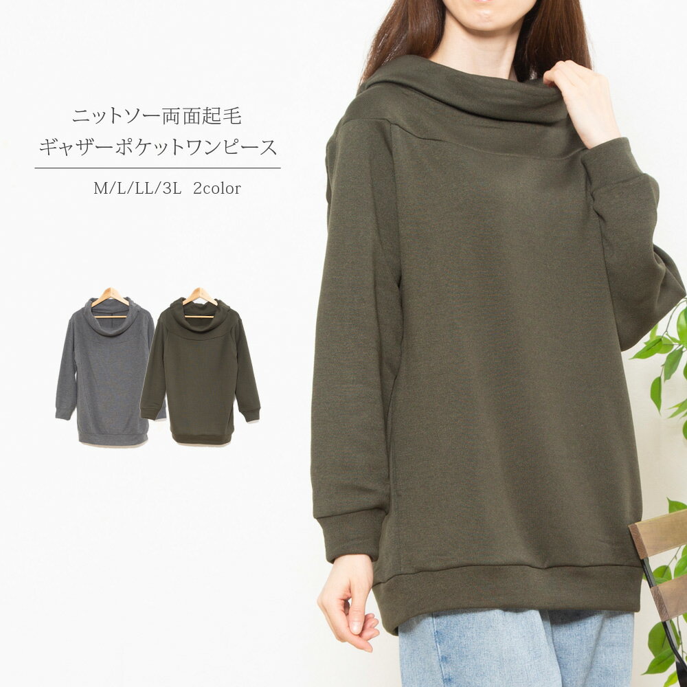 大きいサイズ有り オフタートル両面起毛チュニックワンピース[J](T)